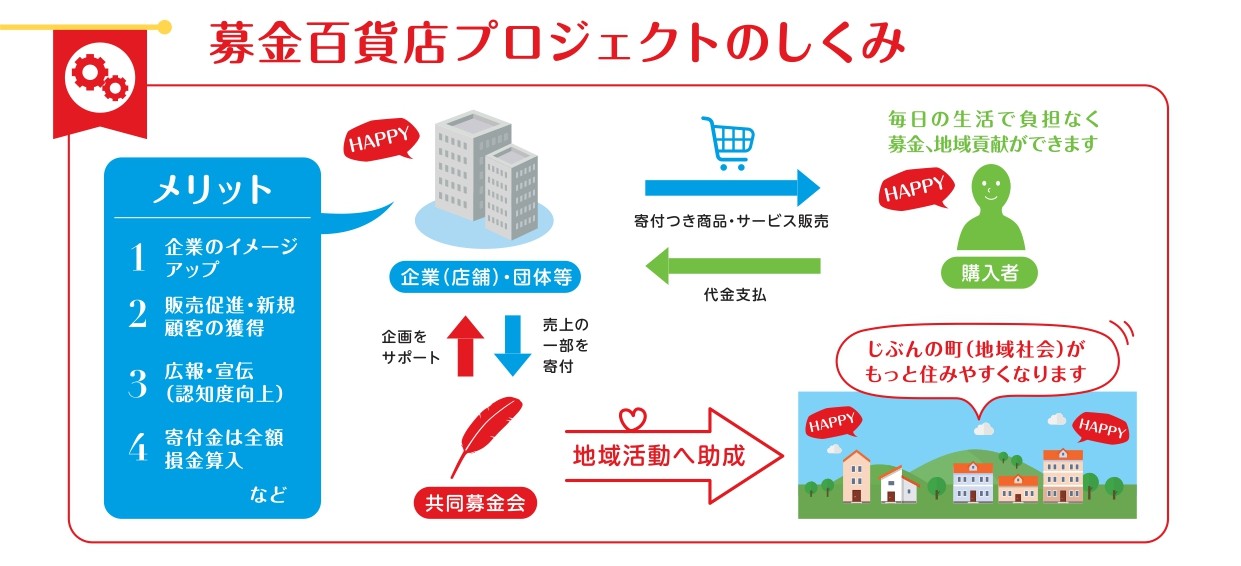 募金百貨店プロジェクトとは、 ”寄付つき商品・企画”を販売し、売上の一部を赤い羽根共同募金に寄付することにより、地域社会に貢献する企業・団体等を募集するプロジェクトです。 商品購入者の負担はなく、企業のイメージアップや販売促進、社会貢献につながります。