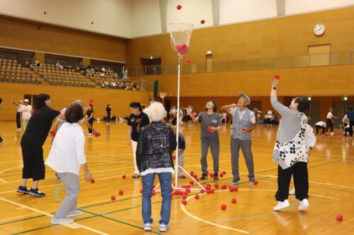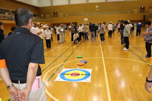 参加者は435名でした。 本大会は、コロナ禍や天候不順により、6年ぶりの開催となりました。場所は屋内に移し、種目は年齢・体力に関わらず誰もが参加しやすいニュースポーツ(ボッチャ、モルック、カローリング)を取り入れ、交流することができました。